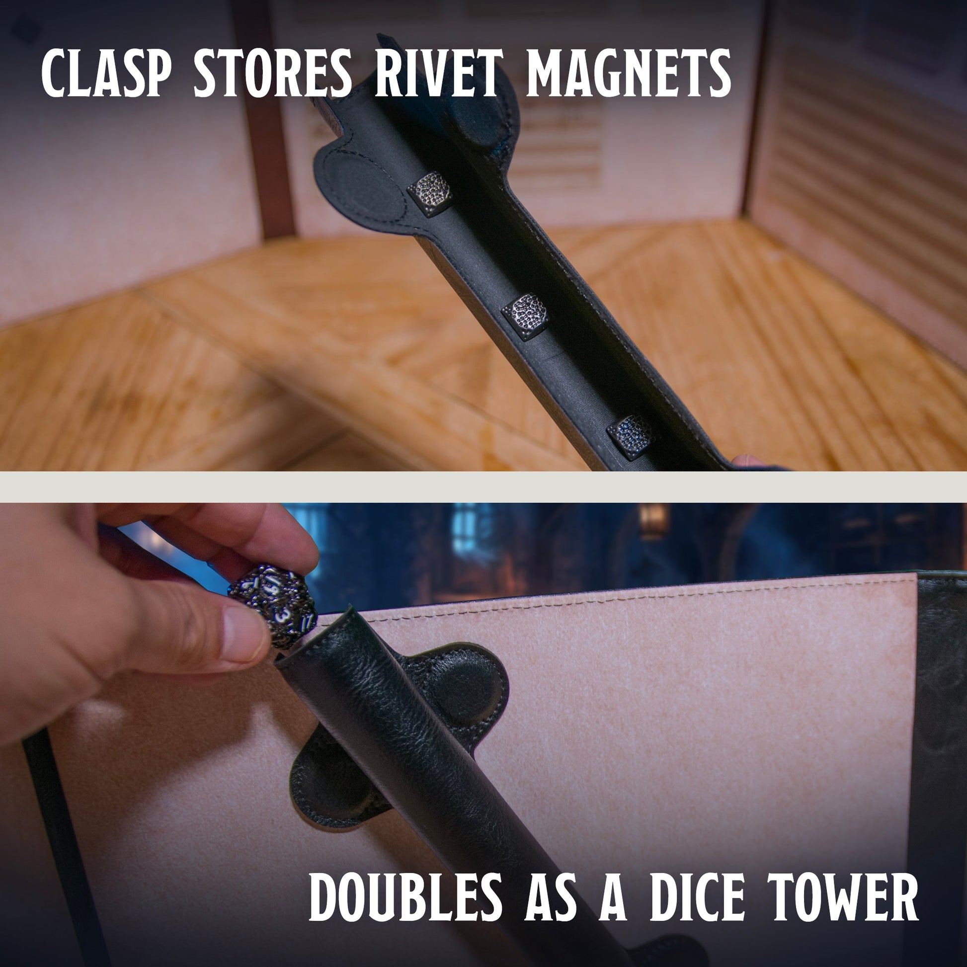 - Dice Tower Clasp - Built-in dice tower that doubles as magnetic storage